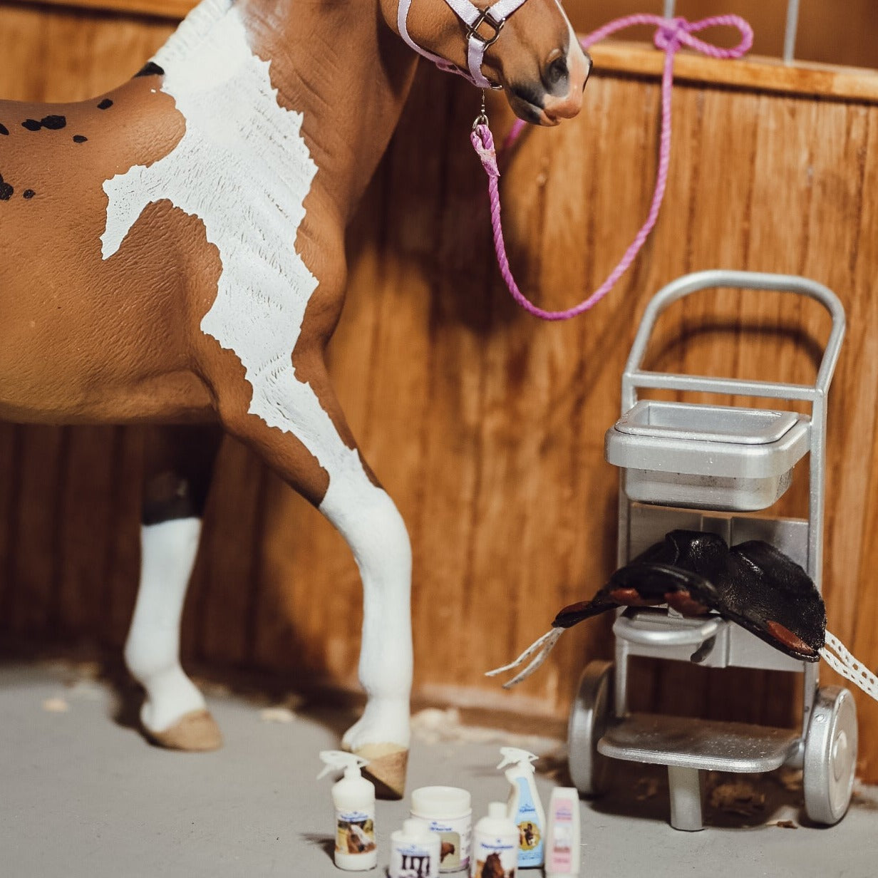 Our 3D printed saddle cart for Breyer Classics and CollectA Deluxe model horses (scale 1:12) is large enough to carry a saddle, a bridle and cleaning supplies in the top box. Its realistic design fits in any miniature tack gear. Choose from pre-painted Black or silver designs or unleash your creativity by opting for the unpainted version, ready for you to customize and match your stable's colors.