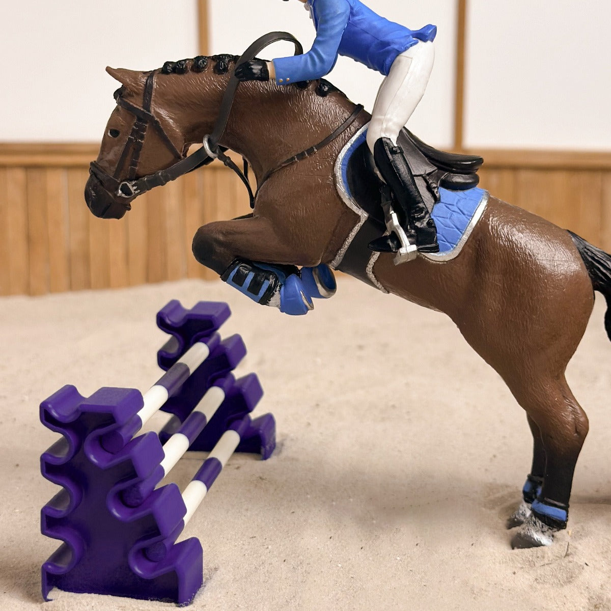 Our realistic 3d printed spa cavaletti block set includes two cavalettis blocks and three poles, making it a perfect addition to your model horse arena. Enjoy the realistic and functional design of our 3D printed jumping fence for Schleich model horses and elevate your arena experience!